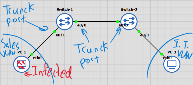 ამ მაგალითში, ჩანს, რომ Sales დეპარტამენტში არის ინფიცირებული კომპიუტერი, ხოლო სამიზნე მოწყობილობა არსებობს I.T. დეპარტამენტში. სამწუხაროდ, Switch-1-ზე არასწორადაა e0/1 პორტი დაკონფიგურირებული: