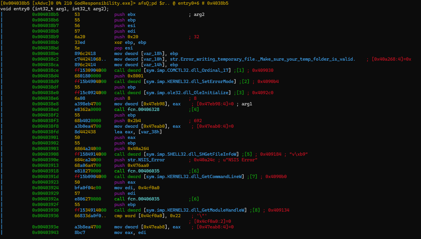 ზოგი ტექსტი წინა malware-შიც აღმოვაჩინე, ასე, რომ ძალიან მაინტერესებს რა მოხდება ამ პროგრამას თუ გავუშვებ. სანამ ამას გავაკეთებ ერთხელ გადავხედავ r2.exe-თი და მერე ჩავაგდებ xdbg-ში.