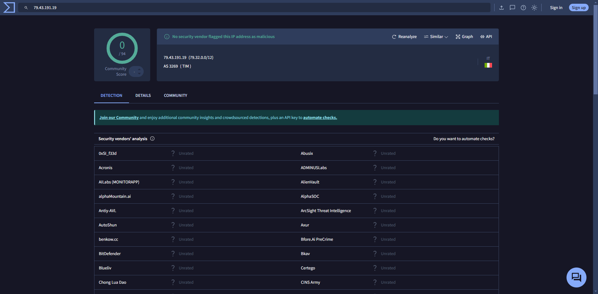 სანამ მოქმედებას დავიწყებდი, მინდოდა გამეგო ზუსტად რა ხდებოდა და ჩემს მეგობრებს დავურეკე, რომლებსაც ასევე აქვთ წვდომა ჩემს სერვერზე. ვიფიქრე, შესაძლოა სწორედ ისინი იყვნენ, მაგრამ შევცდი. არც ერთმა იცოდა რა ხდებოდა. ამის გამო, მომიწია VirusTotal-ზე მენახა ეს აიპი და აღმოჩნდა, რომ საქმე გაცილებით ცუდად იყო: