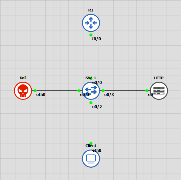 სცენარი რომ გავითამაშო, საჭიროა გარემოს ქონა. ამის გამო, GNS3-ში ავაწყე ვირტუალური ქსელი, სადაც იქნება შემტევი, კლიენტი(საიტის ადმინისტრატორი), HTTP სერვერი, რომელზეც საიტი დაიჰოსტება და ბოლოს როუტერი, რომელიც DHCP სერვერი იქნება და IPv4 მისმართებს გასცემს შემტევზე და ადმინისტრატორზე.