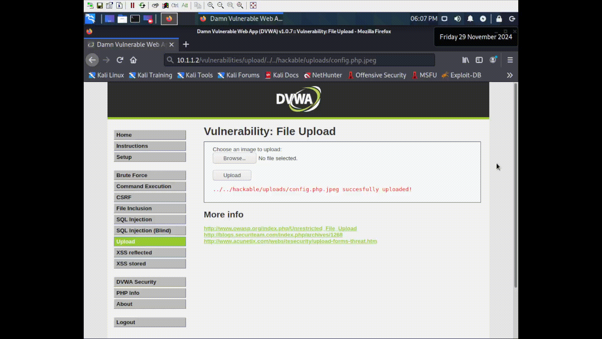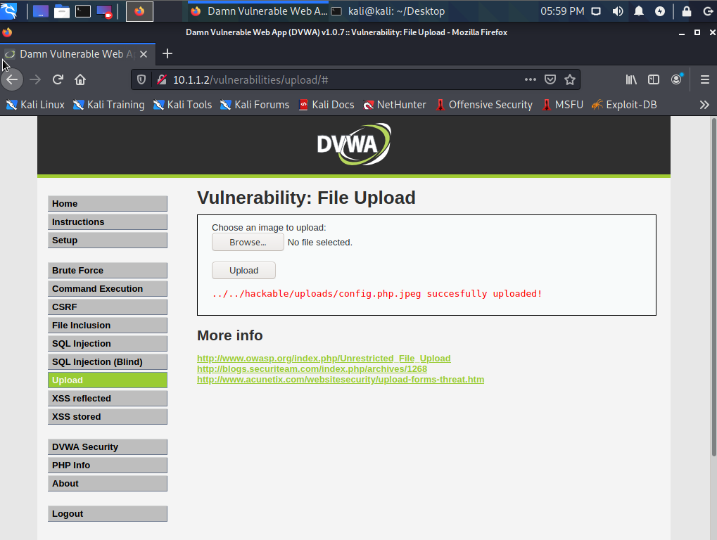 file extension checking-ის დროს, ვებ სერვერი ამოწმებს ფაილის დაბოლოებას(სუფიქსს). მაგალითად, შესაძლოაBackendლოგიკაში ეწეროს, რომ მხოლოდ ის ფაილები უნდა მიიღოს სერვერმაPOSTფორმით, რომელიც ბოლოვდება.png,.jpegან.svgსუფიქსებით. ამ მაგალითში, კი ფაილის სახელიაconfig.php.jpeg, რაცPHPფაილსJPEG/IMAGEფაილად ასაღებს.
