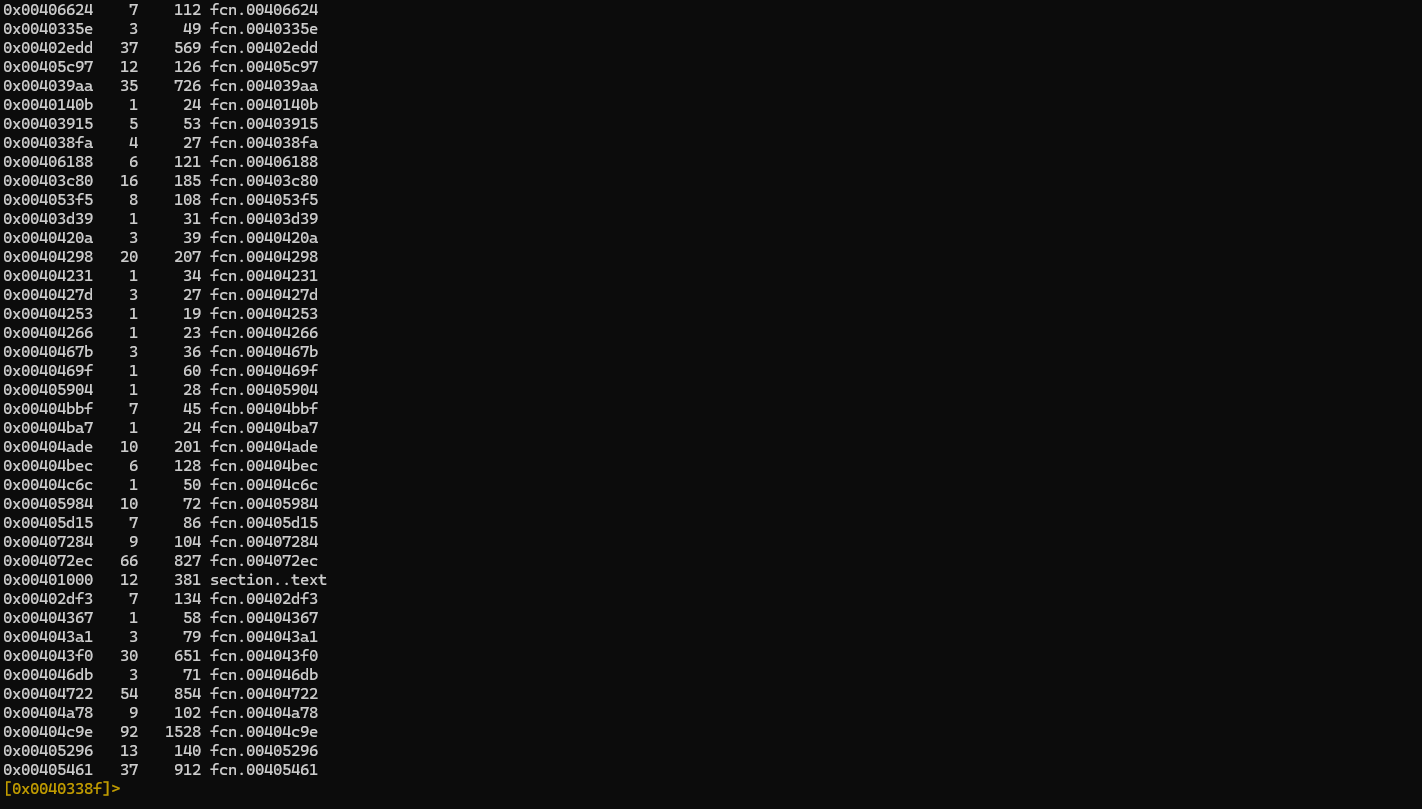 ამ ბრძანებით r2 სრულად გააანალიზებს ფაილს. ფაილის ანალიზის შედეგად მეცოდინება კონკრეტულად რა ხდება ფაილში: