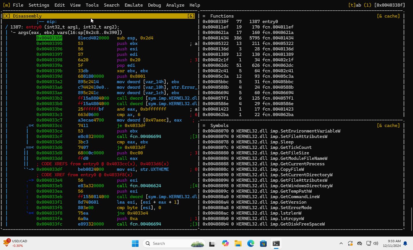 სწორედ ამ ბრძანებით შეიძლება entry0-ზე გადასვლა. ამის შემდეგ, v ბრძანებით შესაძლებელია გრაფიკული ინტერფეისის ჩართვა, რომელიც ნაგულისხმევად(By default) დისასემბლის, სიმბოლოების სიას და გამოყენებული ფუნქციების სიას გამოიტანს: