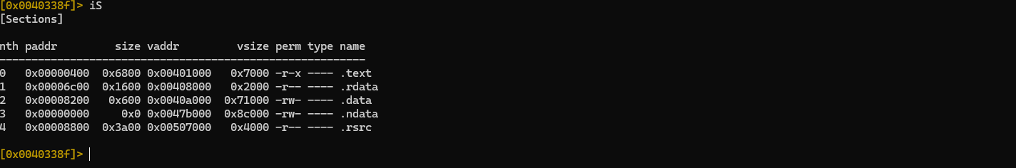 ეს პრომპტი(Prompt) აჩვენებს თუ რომელ Memory Address-ს უყურებს r2. თავდაპირველად, საჭიროა ამ ფაილის სრული ანალიზი: